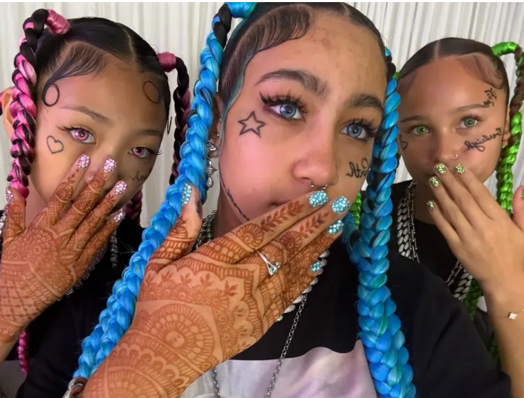 In photos and videos posted to their joint TikTok account, North showed off an eye-catching outfit while hanging out with friends. The oldest child of 45-year-old Kim and her ex-husband Kanye West sported waist-length blue braids, temporary face tattoos, a nose ring, colored contacts, and grillz—even coordinating with her pals, who wore similar styles in different colors.
