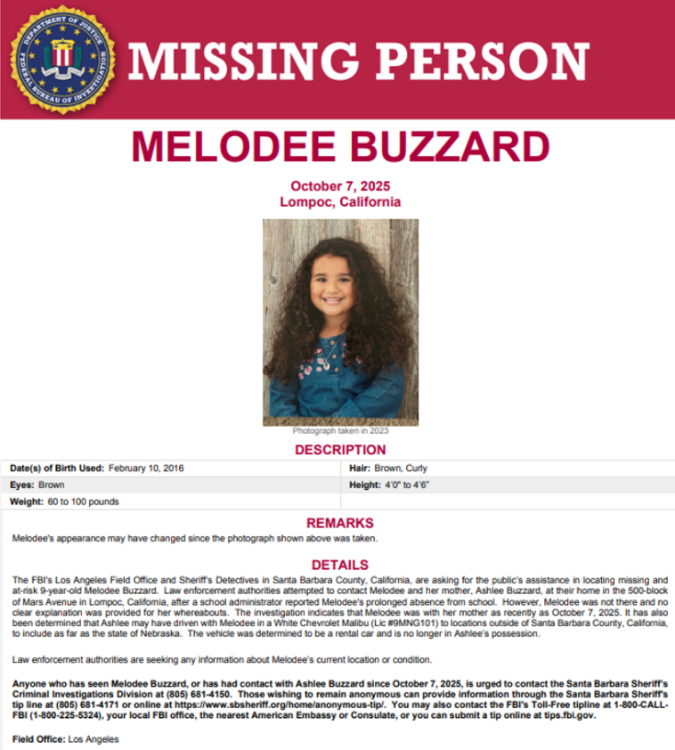 The Santa Barbara County Sheriff’s Office has released new surveillance images of 9-year-old Melodee Buzzard—photos taken on October 7, the last confirmed day she was seen—and authorities believe the child may have worn a wig to change her look. The development comes as Melodee’s mother, Ashlee Buzzard, continues to refuse cooperation in the search for the missing girl, who has been unaccounted for more than two weeks.