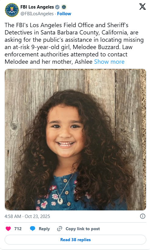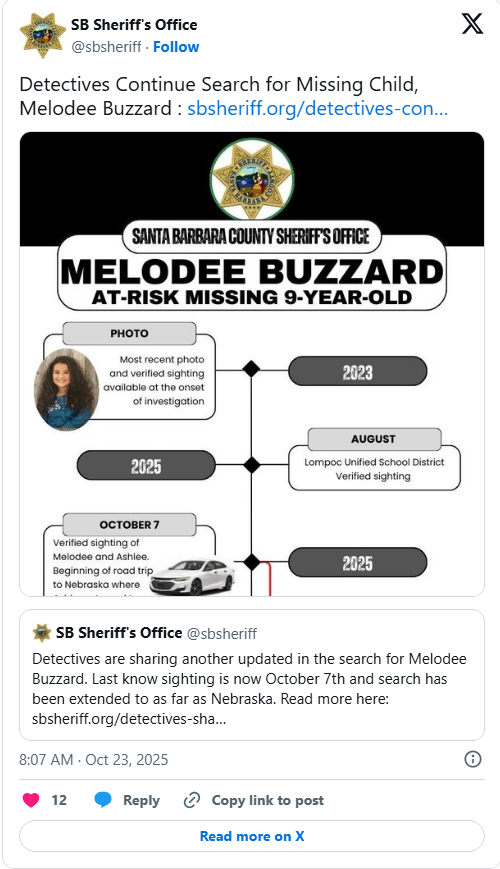 “The Santa Barbara Sheriff’s Office shares the community’s fear for Melodee’s safety, and we’re doing everything to bring her home,” said Sheriff Bill Brown. “Our detectives are following every lead, and we keep asking the public for help—any piece of information could be the key to finding her. We remain fully committed to getting Melodee back safely.”