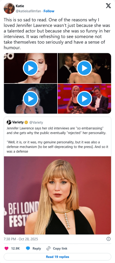 Her remarks quickly went viral on X (formerly Twitter), where fans rushed to push back against her self-criticism. “This breaks my heart,” one user wrote. “I loved Jennifer not just for her talent, but because she was hilarious in interviews. It was so refreshing to see someone who didn’t take themselves too seriously—who had actual personality.”