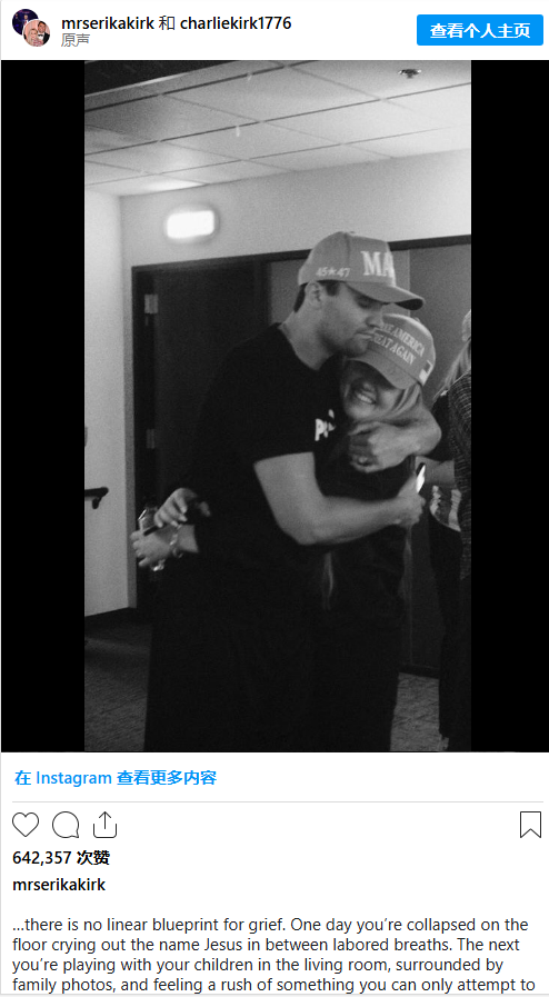 “…grief doesn’t follow a step-by-step blueprint,” Erika wrote in her Instagram post, which included footage of Charlie’s memorials across the country. “One day, you’re crumpled on the floor, gasping out Jesus’ name between shaky breaths. The next, you’re playing with your kids in the living room—surrounded by family photos—and suddenly feel a rush of something you can only call a God-given, bittersweet joy. A smile creeps onto your face, and you don’t know quite how to name it.”